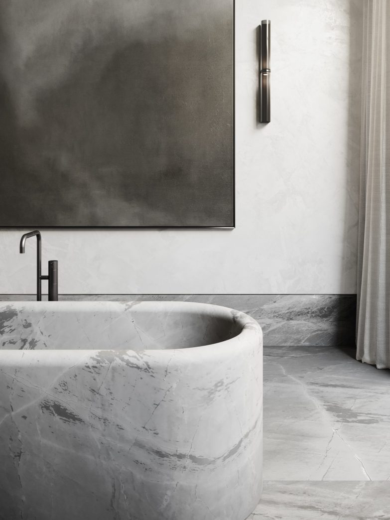 ‘Heralding Australian designers and makers ‘The Bathroom’s tranquil essence is anchored by an elegantly monochrome palette to temper the senses after a long day, and support a mental and physical unwinding. Balancing the peaceful austeriry is a highly tactile layering of striking Elba stone, artisanal smoked glass wall sconce by Articolo Studios, hancrafted architectural hardware by silversmith VBrokkr, ethereal artwork by Greg Wood, and a New Volumes bath with a monolithic cured from bestowing brevity, purpose and cementing the elevated relevance of the bathroom space in today’s domestic vernacular.