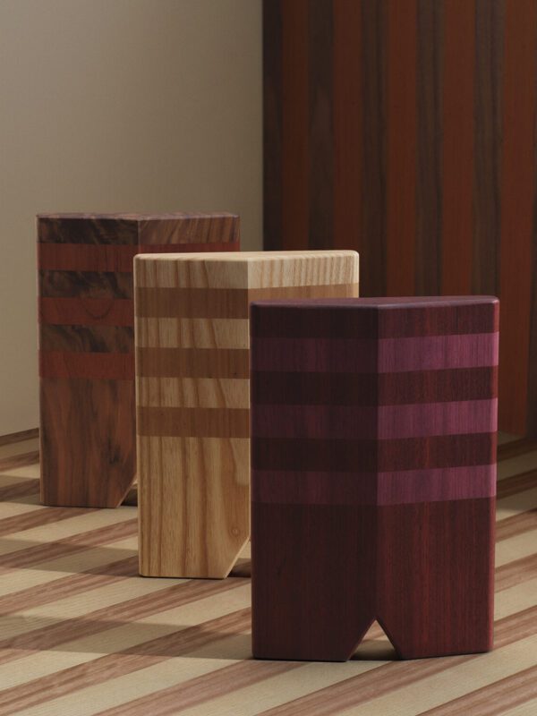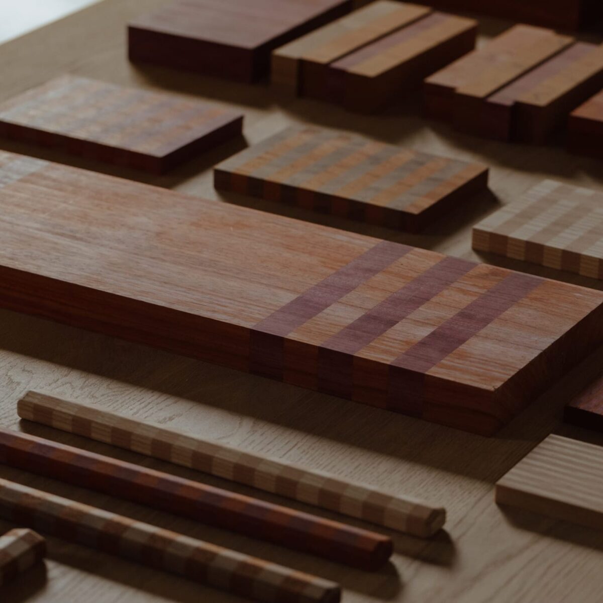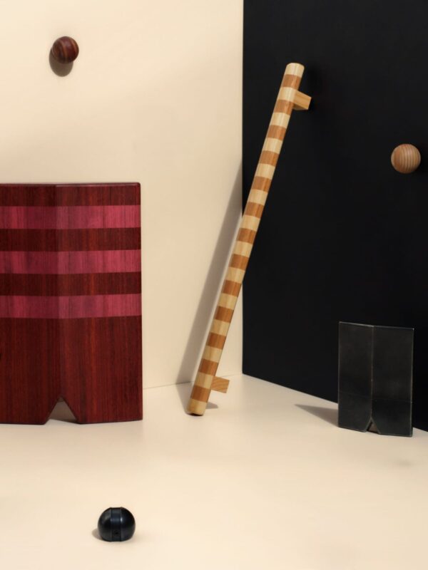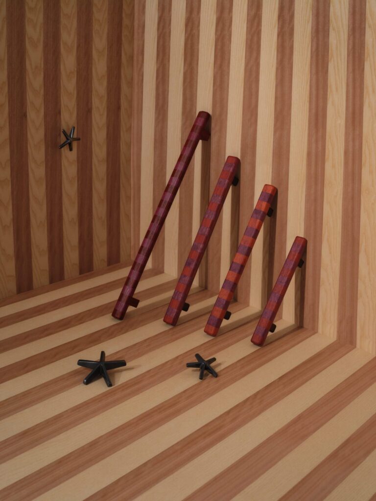 Demonstrating both the beauty, dexterity and strength of timber, the spirited ensemble of door levers, pulls and joinery pieces featuring stripes in contrasting tones and playful experimentations in scale is superbly crafted from species that span the globe.