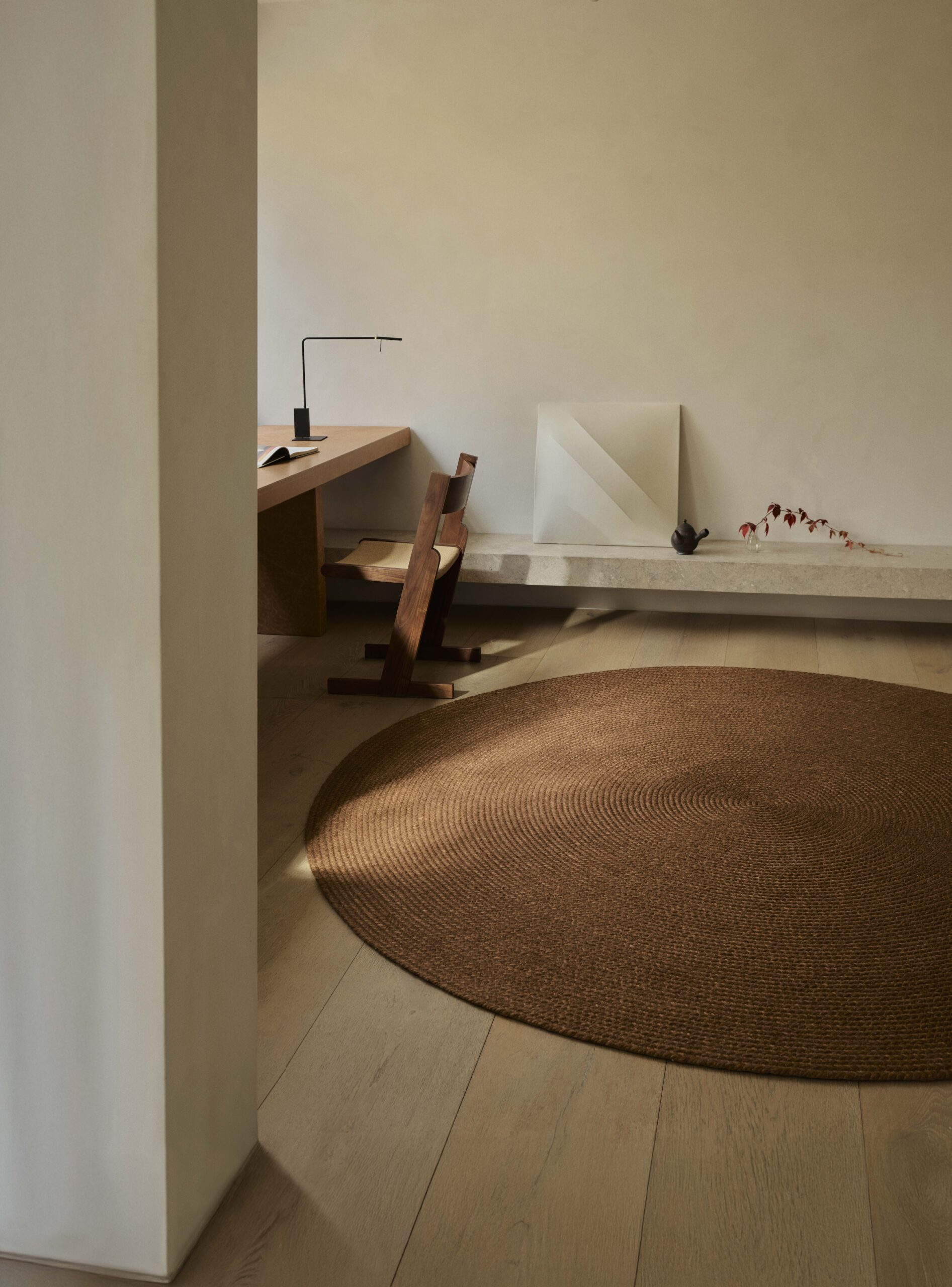 The Braid rug is hand-plaited from a luxurious wool-blend yarn that is carefully coiled then stitched into its circular form. Cloaked in vibrant yet elegant tones, the rug’s pairing of gentle curves and rippling texture brings harmony to the home, even when laid in the most unexpected of spaces.