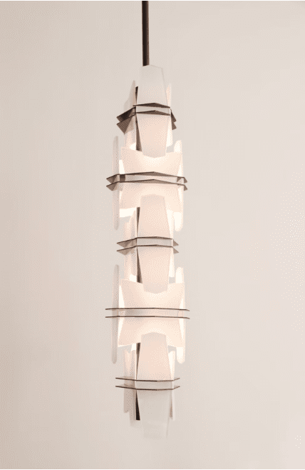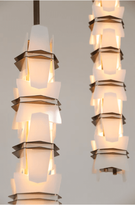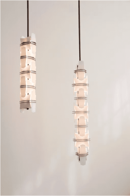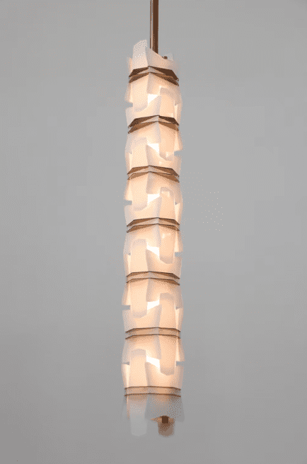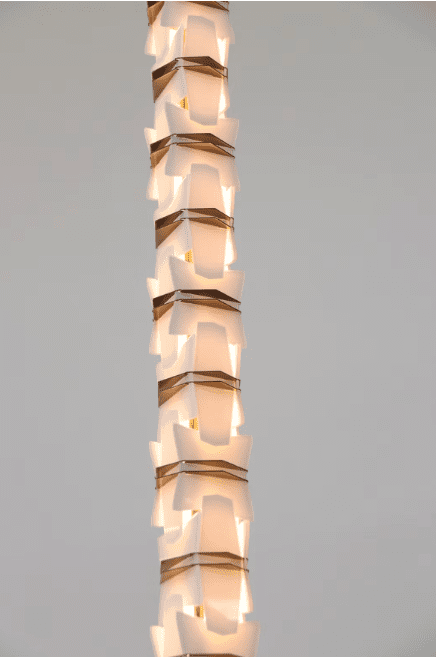 Covenant takes cues from vertebrate anatomy, or more specifically, the spine of a snake. Clad with interlocking slices of white glass and brass hardware, Covenant exudes the elegance of a classic chandelier while maintaining a contemporary aesthetic.