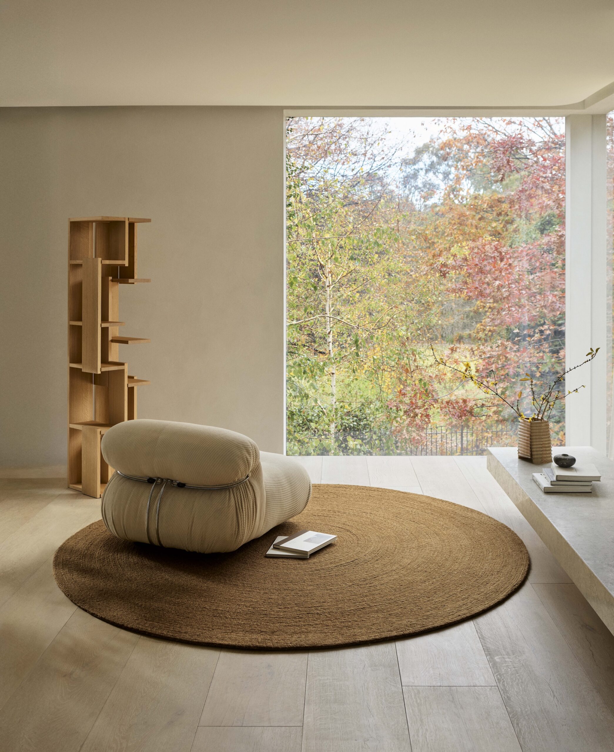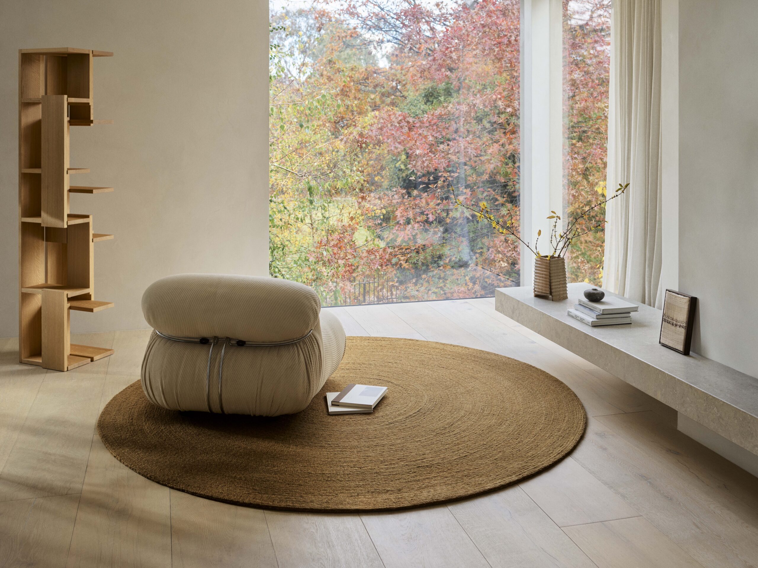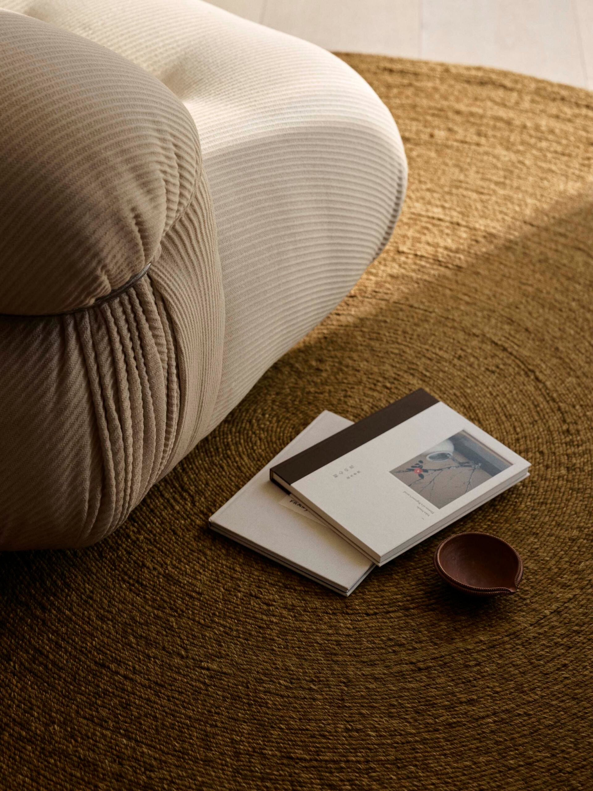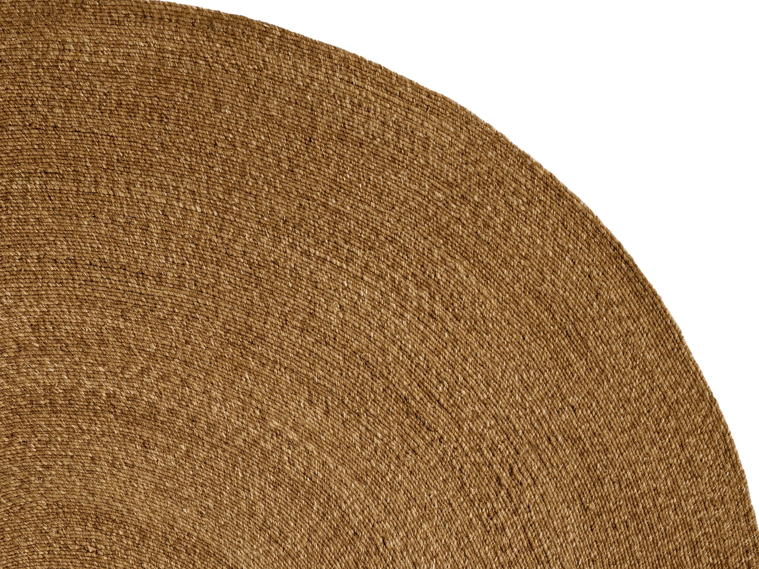 Luna is a refined expression of balance and form. Intentionally rich and warm in colour, abrash-dyed wool is wrapped around a cotton core, then braided and coiled into a sculptural round, secured with hand stitching that adds strength and a subtle tactile detail.