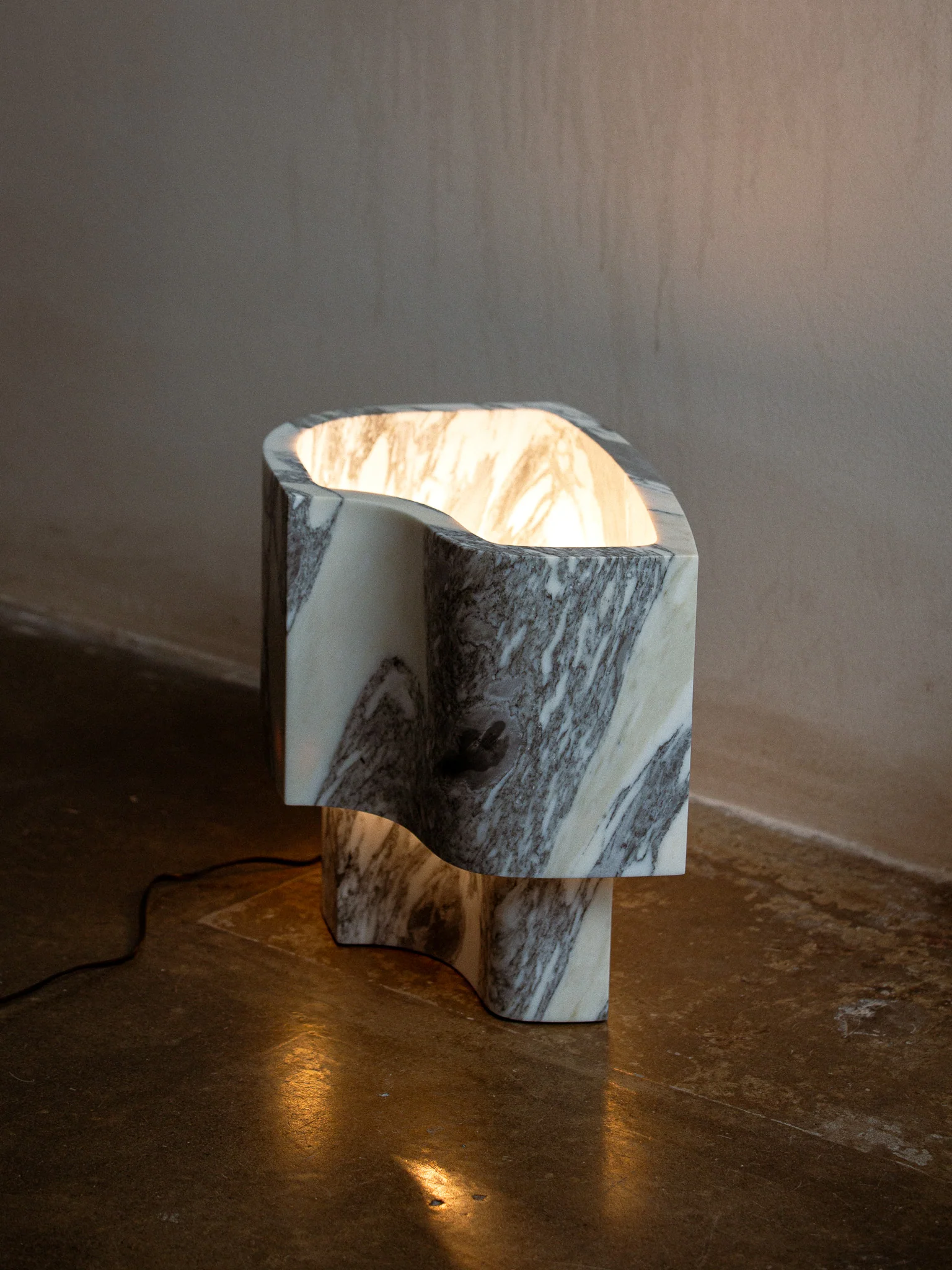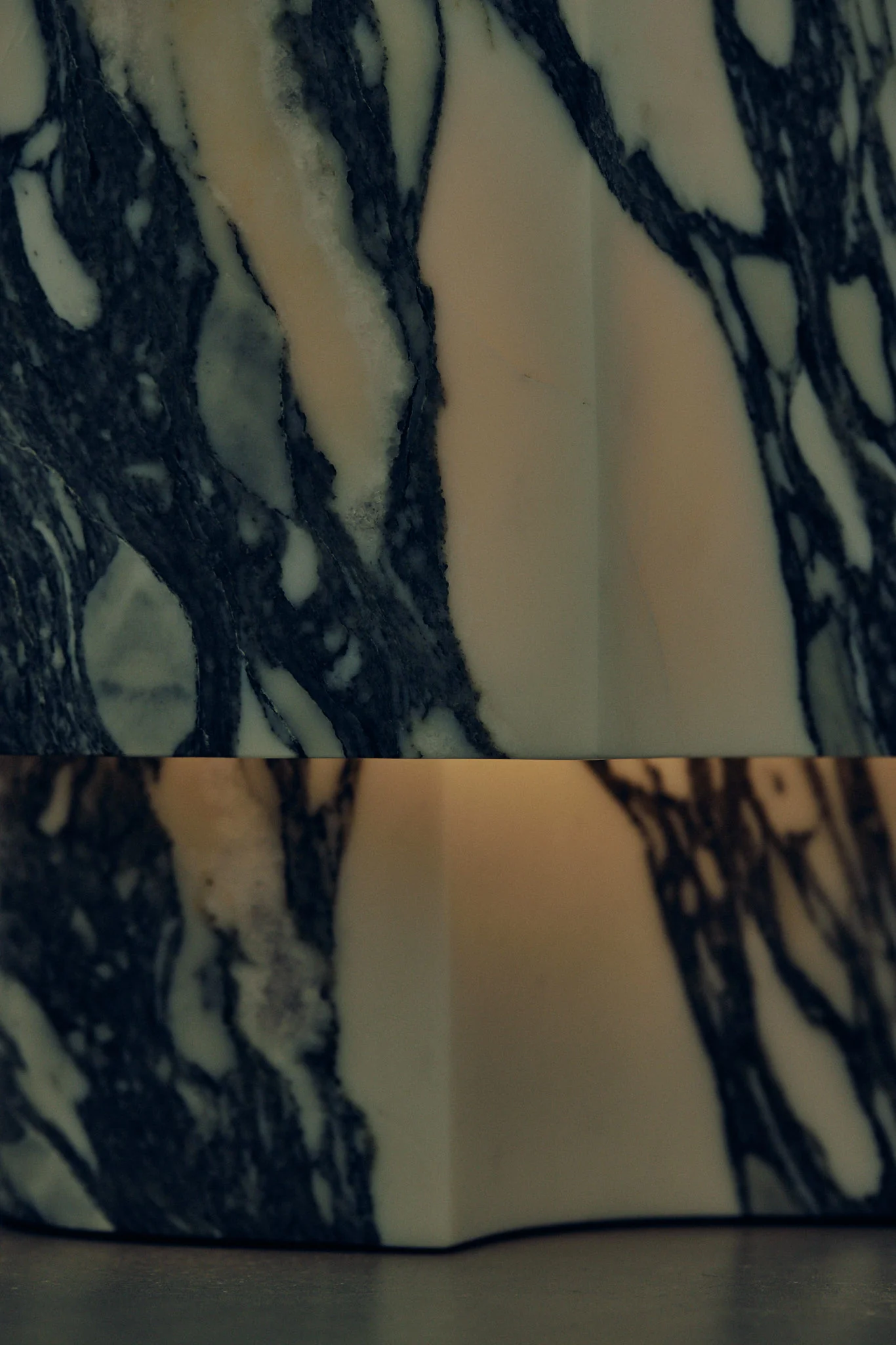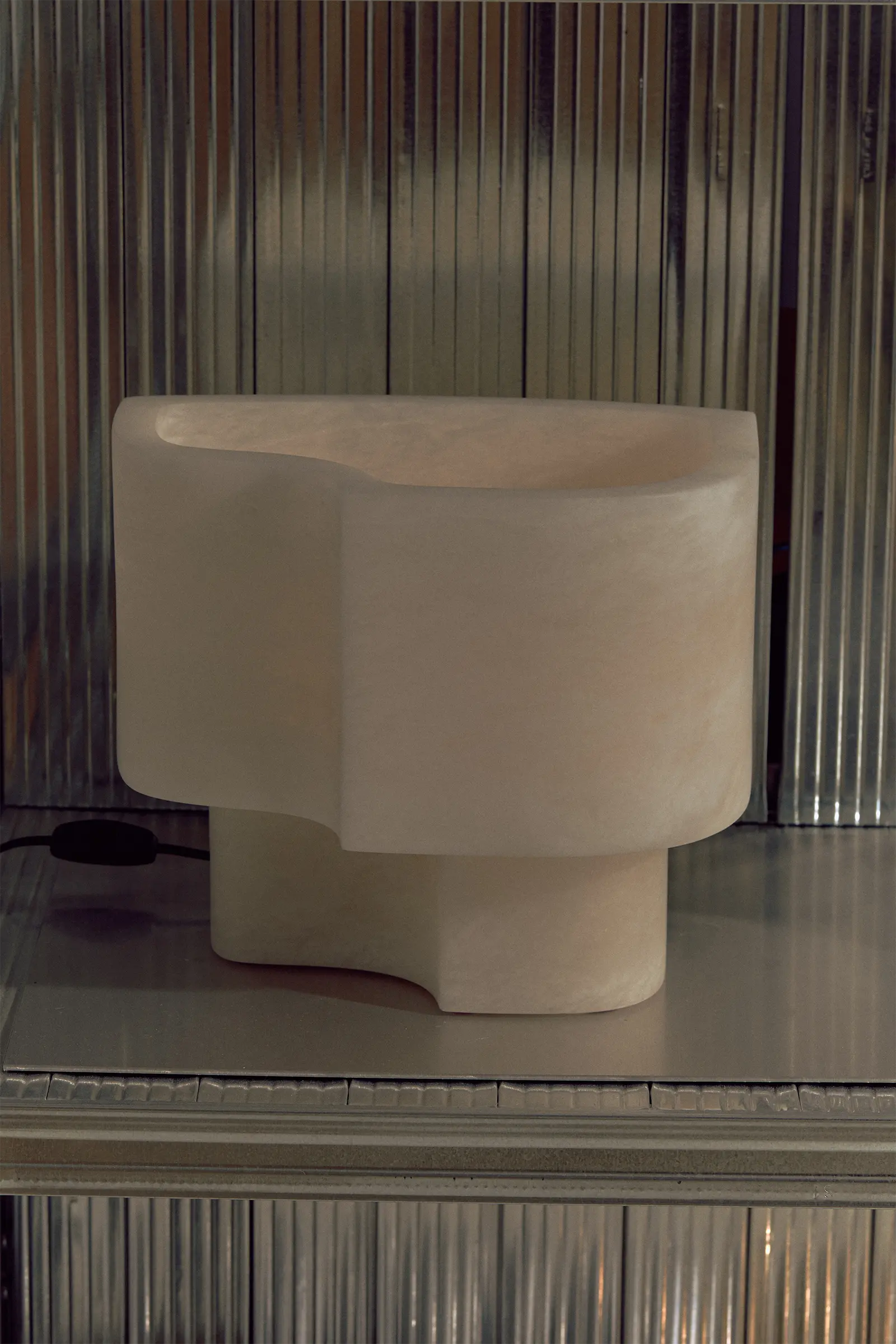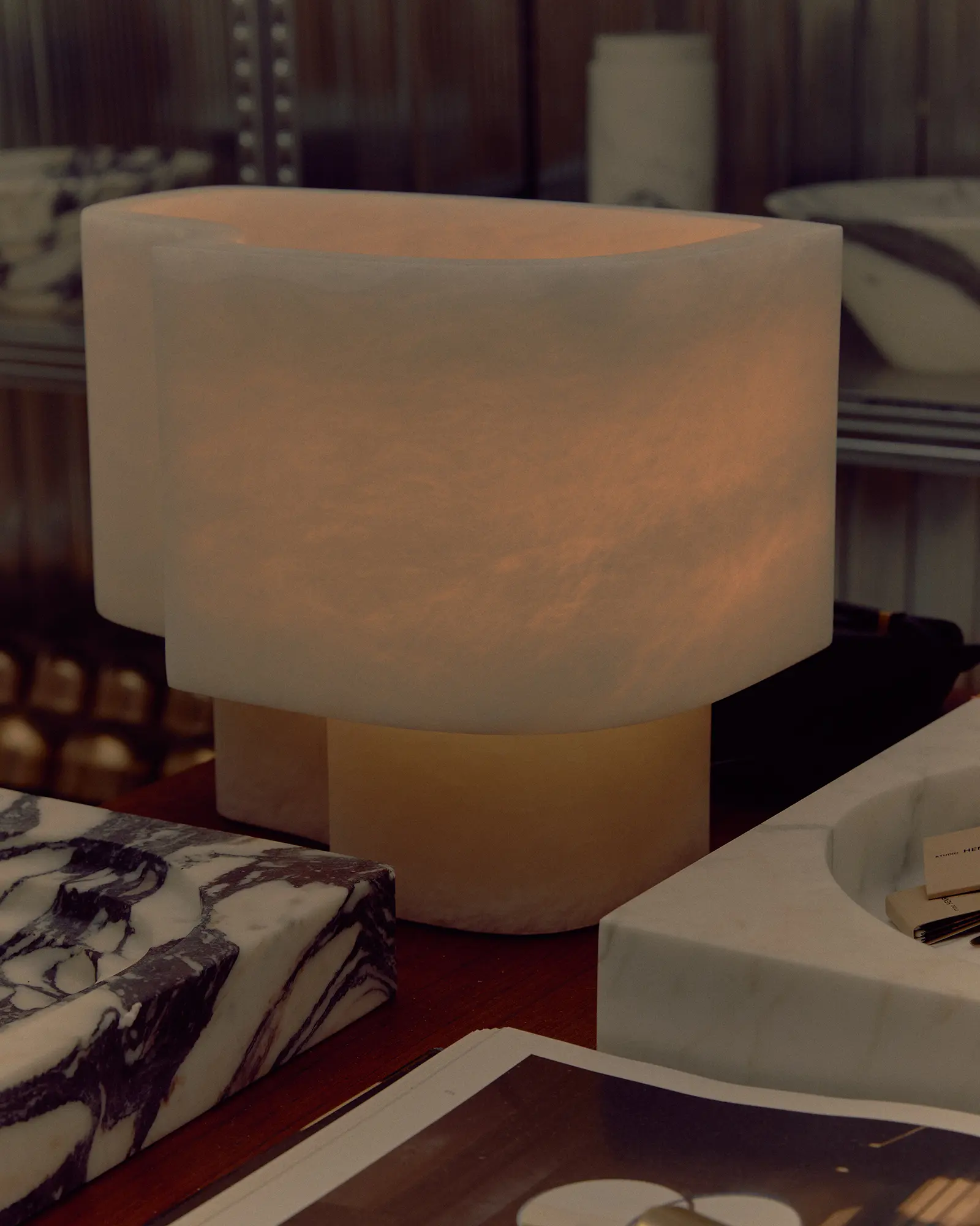 A highly sculptural lamp of imposing proportions, yet one that effects a discreet presence by means of simplified forms and subdued light. The shade is offset from the base, extending like an extrusion and allowing light to reveal its internal features. Available in four types of marble, each with distinctive colouring and veining, the Offset Lamp provides options to suit diverse settings and palettes. Read More +