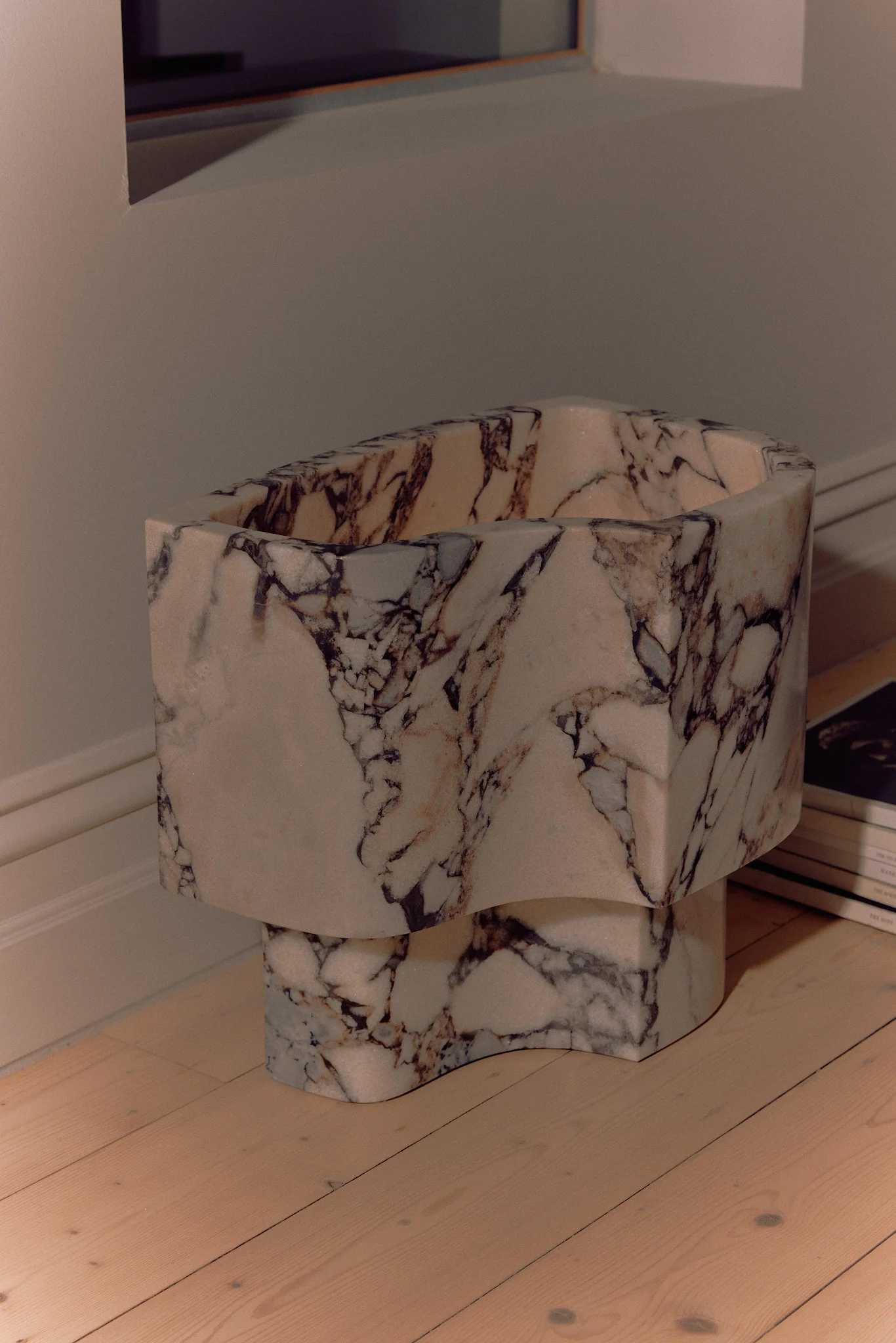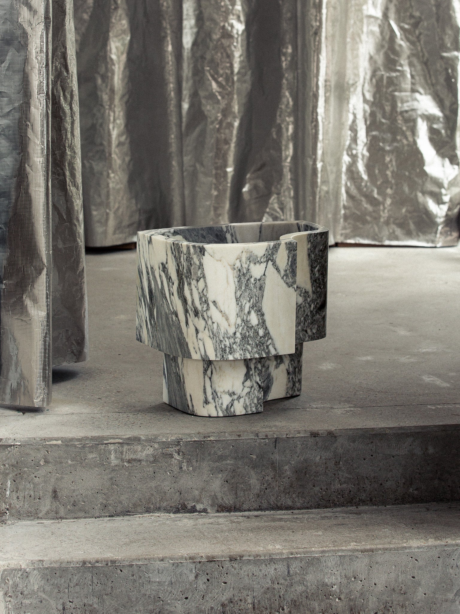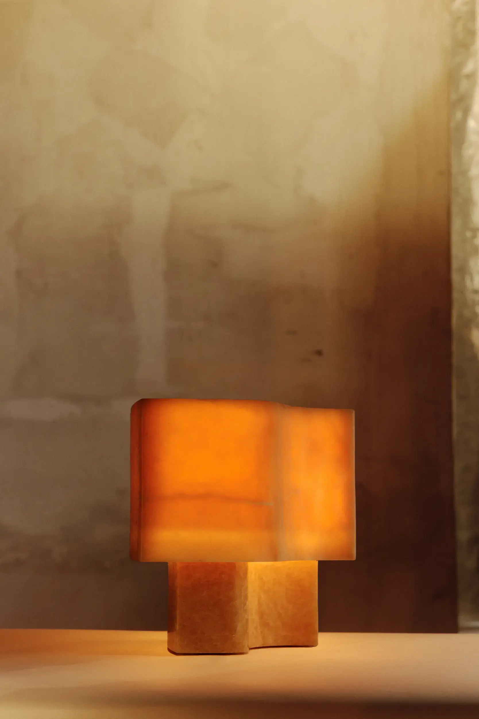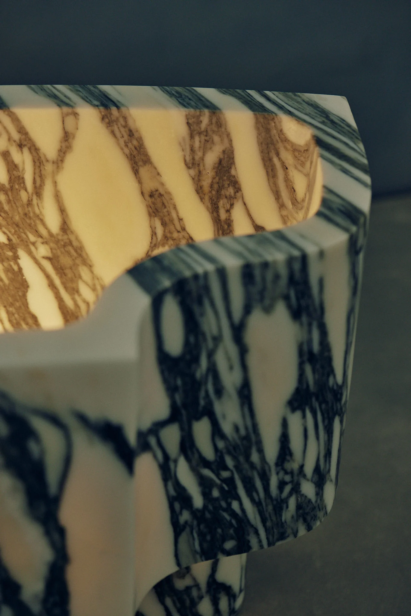 A highly sculptural lamp of imposing proportions, yet one that effects a discreet presence by means of simplified forms and subdued light. The shade is offset from the base, extending like an extrusion and allowing light to reveal its internal features. Available in four types of marble, each with distinctive colouring and veining, the Offset Lamp provides options to suit diverse settings and palettes. Read More +