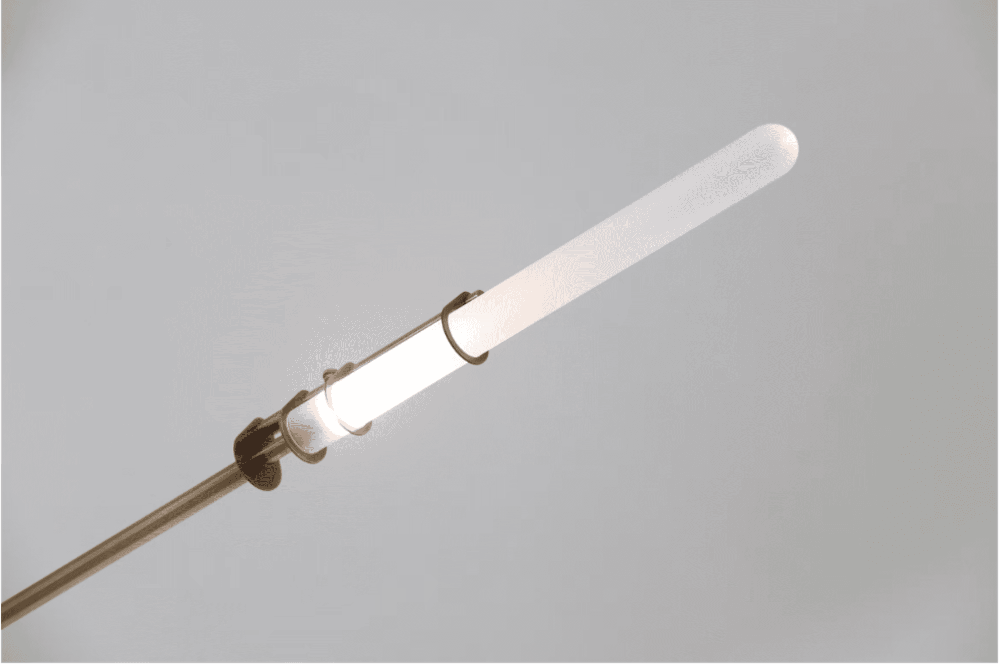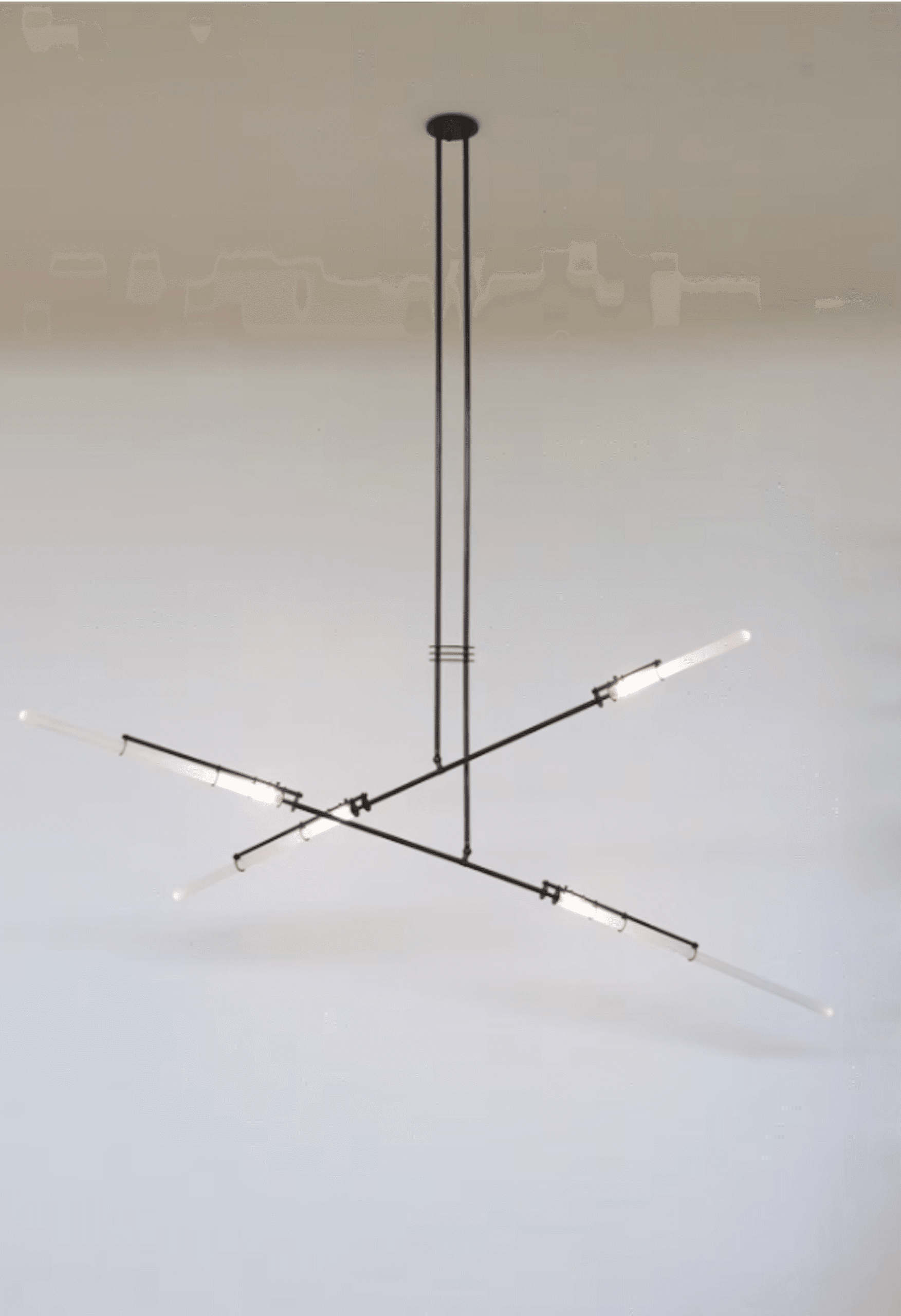 Covenant takes cues from vertebrate anatomy, or more specifically, the spine of a snake. Clad with interlocking slices of white glass and brass hardware, Covenant exudes the elegance of a classic chandelier while maintaining a contemporary aesthetic.