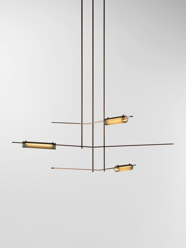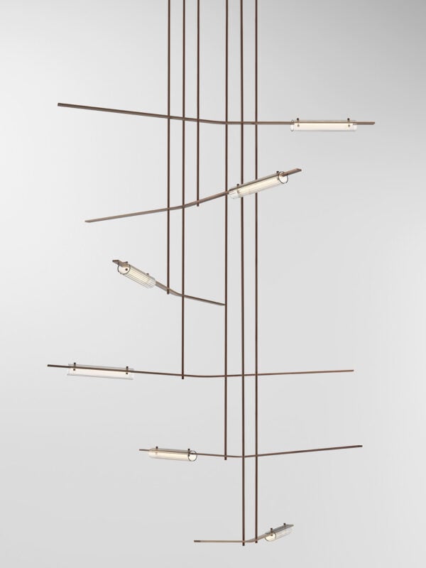 Volant’s modular and architectural nature allow the fixture to span across a plethora of interior spaces. The solid brass bars are individually machined with the luminaire defined by a white glass diffuser which is pinned in-place to the solid brass bar. Textured tubular glass elements are balanced on the same pins creating a uniquely formed illumination.