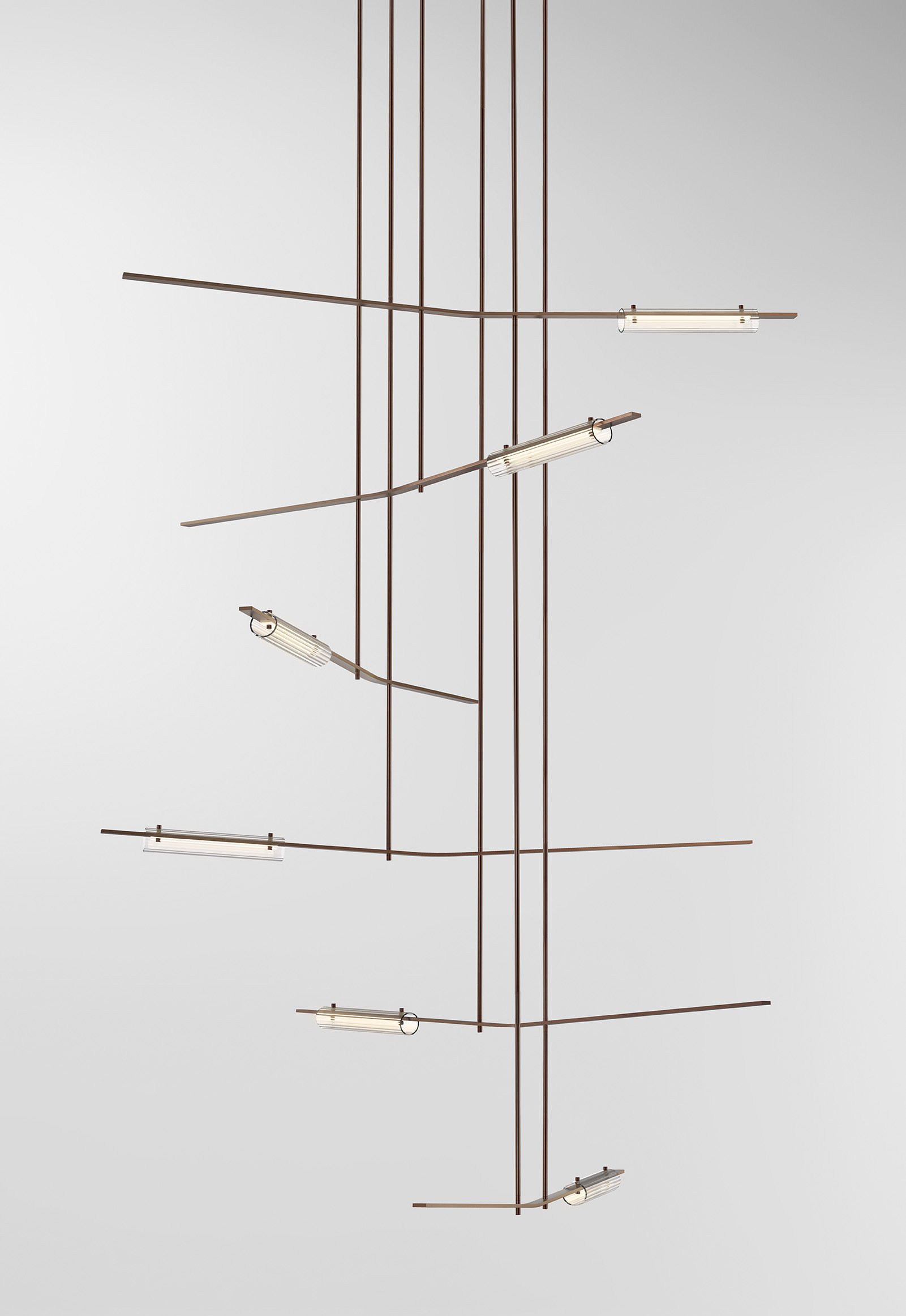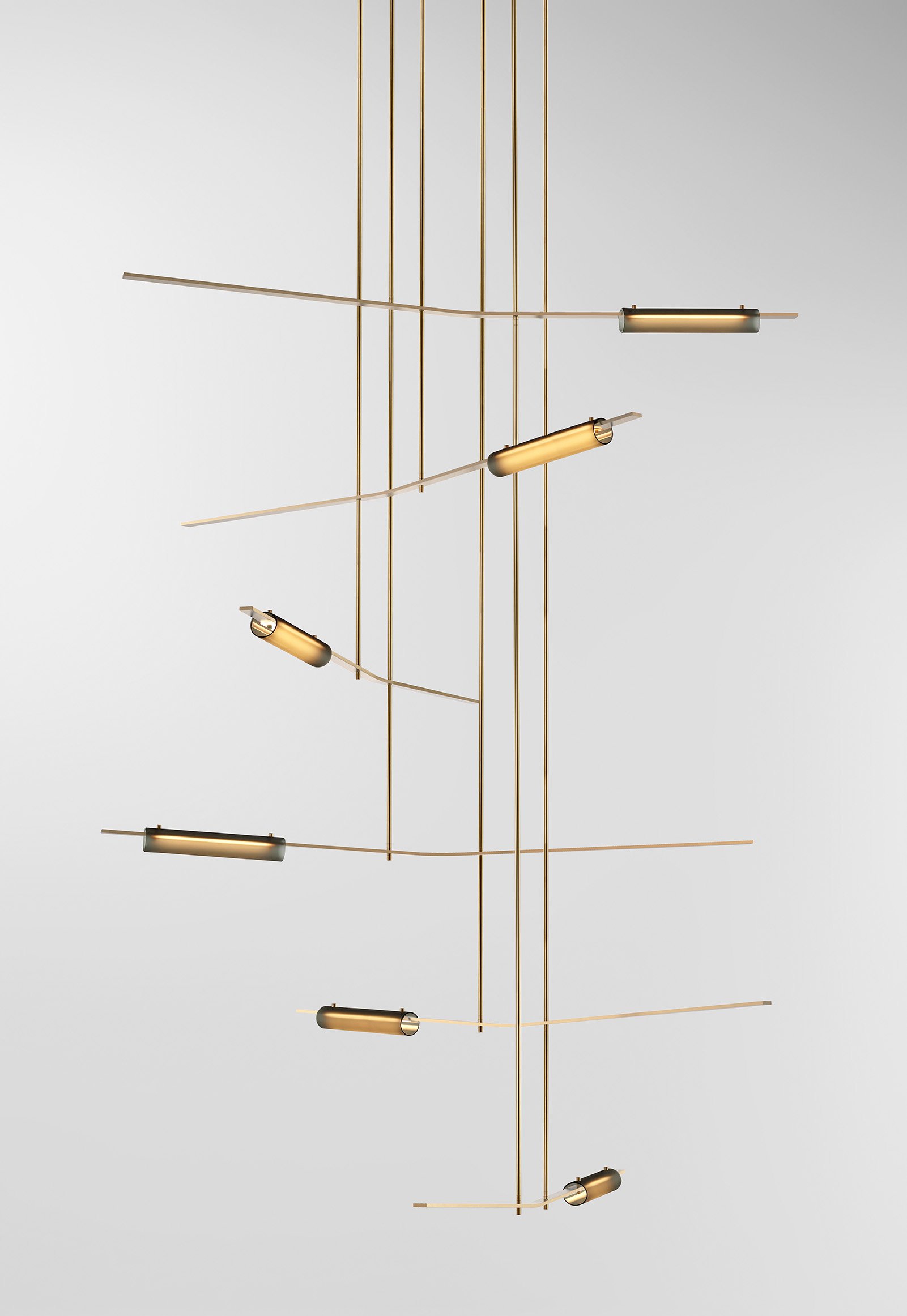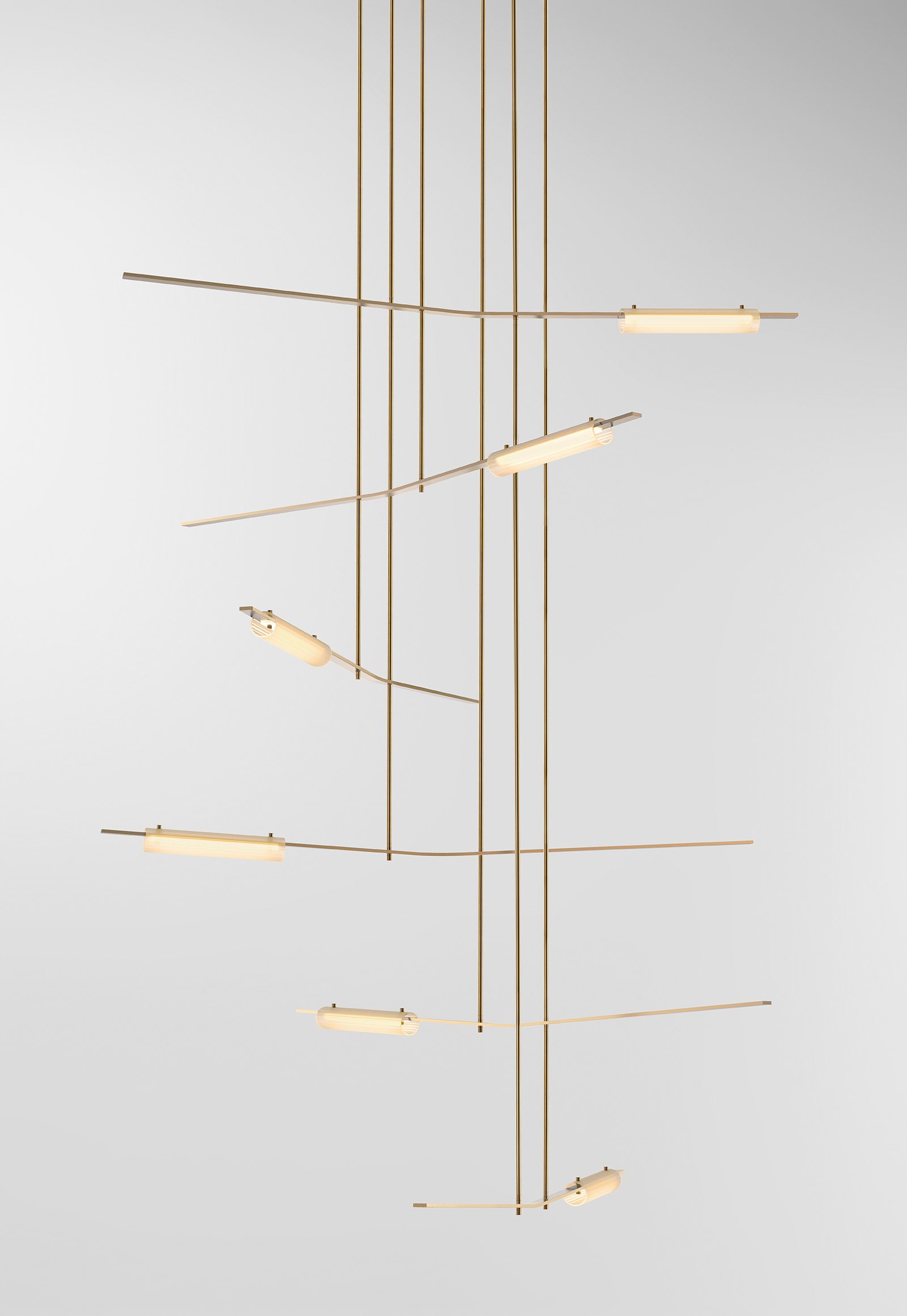 Volant’s modular and architectural nature allow the fixture to span across a plethora of interior spaces. The solid brass bars are individually machined with the luminaire defined by a white glass diffuser which is pinned in-place to the solid brass bar. Textured tubular glass elements are balanced on the same pins creating a uniquely formed illumination.