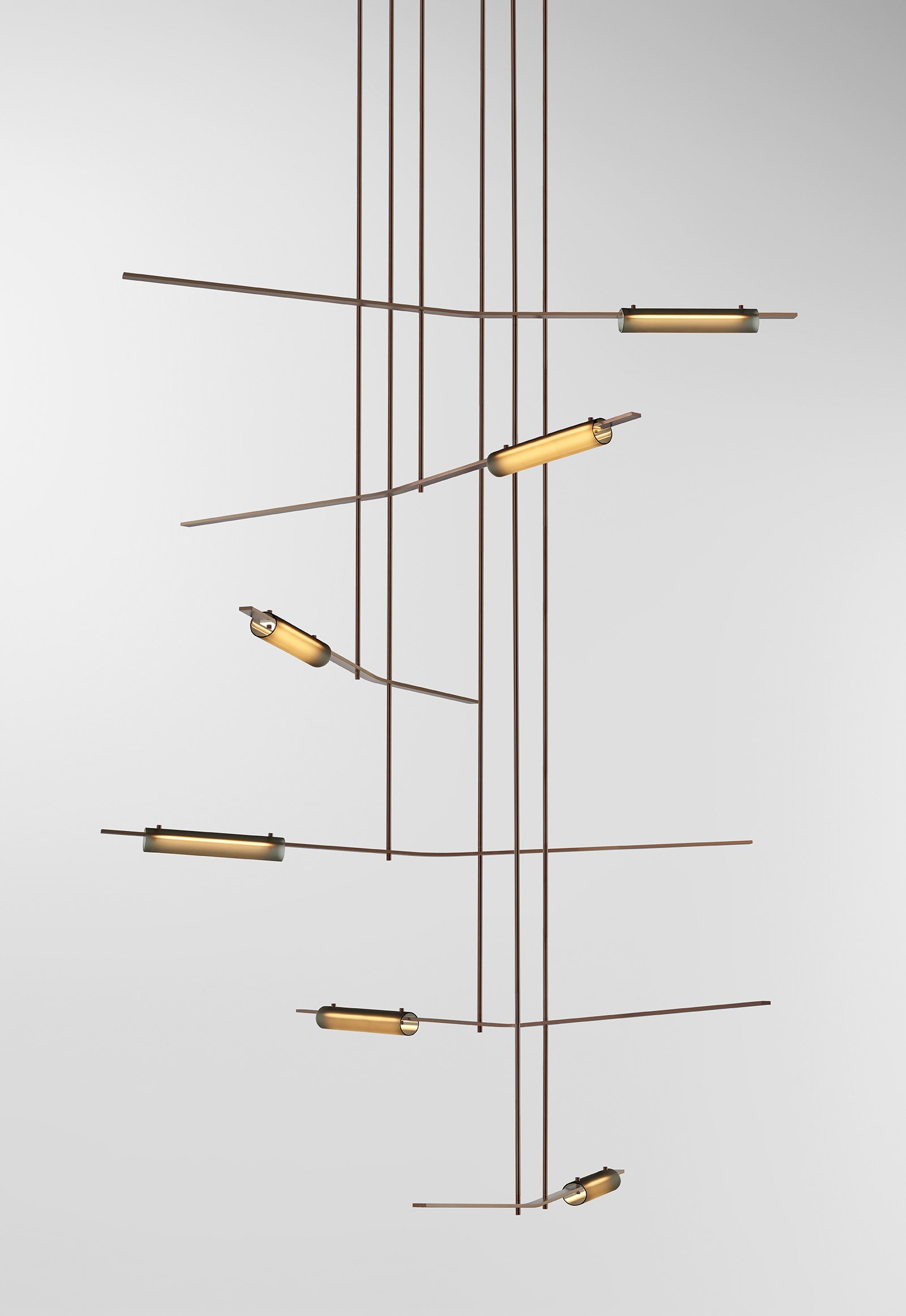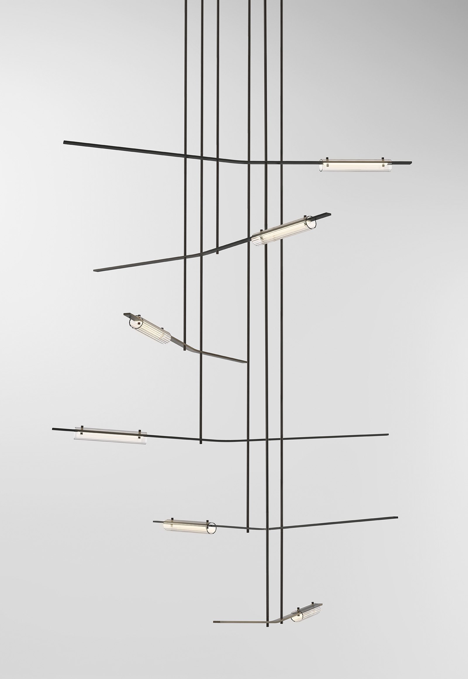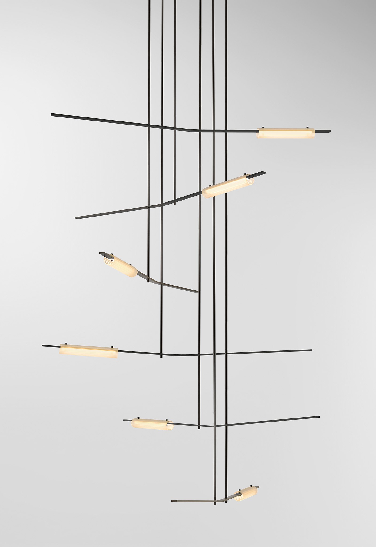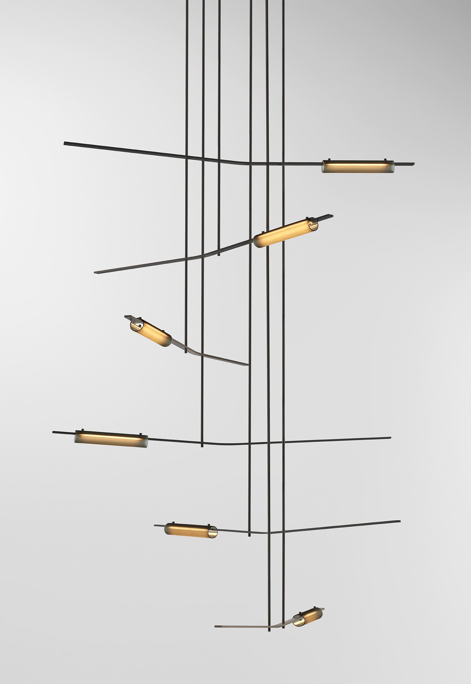 Volant’s modular and architectural nature allow the fixture to span across a plethora of interior spaces. The solid brass bars are individually machined with the luminaire defined by a white glass diffuser which is pinned in-place to the solid brass bar. Textured tubular glass elements are balanced on the same pins creating a uniquely formed illumination.